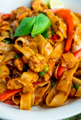 Stir-fried broad rice noodles, egg, and mixed vegetables in a spicy sauce